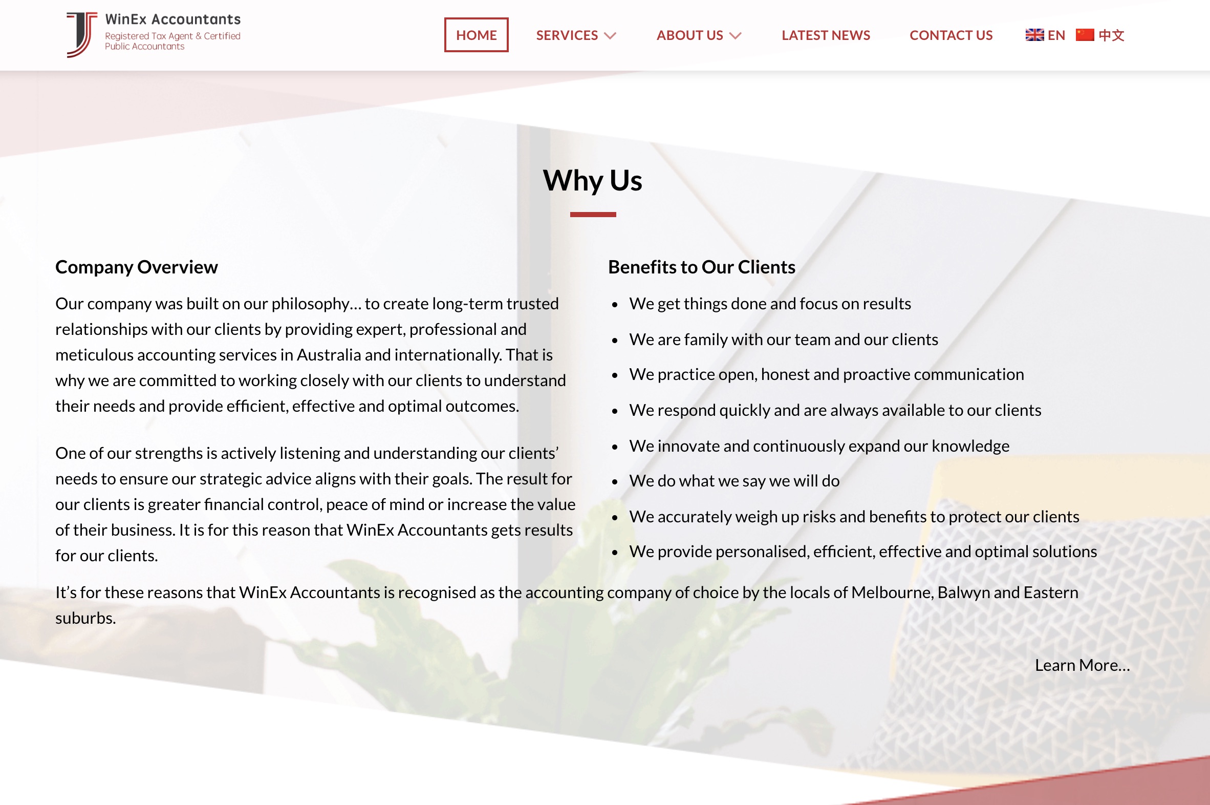 正是因为这样的追求,WinEx Accountants在墨尔本、Balwyn以及东区享有盛誉,被视为会计事务所的不二之选。